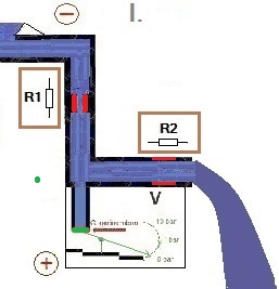 II.) Nun stemmt sich Widerstand R2 mit kleinerem Durchgang, gegen den Strom aus hier weiter geöffnetem R1. Es passt nicht alles Wasser aus R1 zeitgleich durch R2.