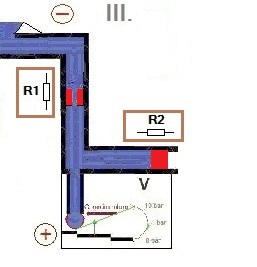 R=U/I gibt unstrittig vor: Ansteigende Spannung, oder Druck, vor einem Widerstand, läßt den zugehörigen Strom durch diesen Widerstand in gleichem Maße mit ansteigen. Das bedeutet: Der ansteigende "was nicht passt muß warten"-Staudruck vor R2 zwingt jetzt mehr Wasser gleichzeitig durch R2, und "verharrt", wenn gleichviel Wasser durch R2 gepresst wird, wie dabei durch R1 nachströmt. Das Mütz-Voltmeter, zwischen den beiden Widerstanden zeigt dabei einen mittleren, Staudruck-Spannungswert (vielleicht von 5 bar) an.