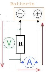 Messung von Spannung (V) und Strom (A) an einem Widerstand (R).