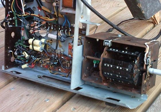 ... gehört innen an diesen alten Trommelkanalwähler (rechts im Bild). Die darin enthaltenen Silberdrahtspulen sind nun so umgelötet, das sich mit jeder Drehung ein anderer Schalter ergibt. Hierüber können jetzt alle Monitor-Einstellungen wie (Helligkeit, Bildbreite usw.) beeinflußt werden. Links ist die Sockelverschaltung zum Ton- Verstärker zu sehen...