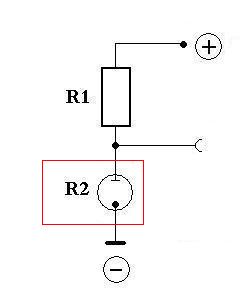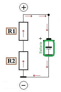 Es beginnt mit elektrischem Gleichstrom -wie aus einer Batterie, der durch zwei Widerstände fließt, die sich in einer Reihe befinden -> Widerstand R1 und Widerstand R2.