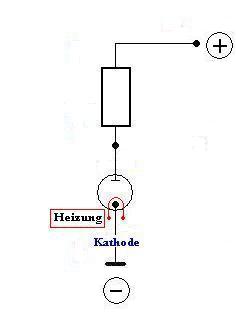 Röhren-Heizungen werden mit vergleichsweise geringer Spannung betrieben. Bei (E) Röhren wie der ECC82 sind es 6,3 Volt, bei "P" Typen wie die PL36 ist statt dessen der erforderliche Heizstrom die Bezugsgröße. Für die PL36 sind 0,3A Heizstrom vorgegeben, die sich im Beispiel bei 25V Spannung einstellen. Ob eine Röhrenheizung mit Gleich- oder Wechselstrom betrieben wird ist soweit egal. Ist der Heizdraht selbst auch die Kathode, spricht man von "direkt beheizter Kathode " bzw. direkt beheizten Röhren.