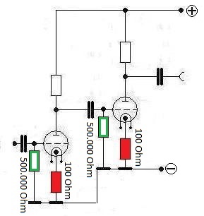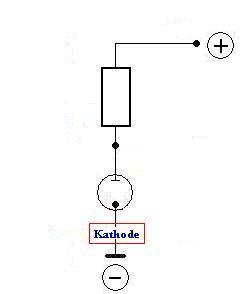 unterhalb der Kathode einen nächsten Widerstand ein. Die Kathode ist nun entsprechend dem Spannungsabfall an diesem Kathodenwiderstand positiver als Minus. Das Gitter hat über den Gitterableitwiderstand weiterhin Kontakt zu Minus. Der recht hohe Wert etwa 500.000 Ohm (500 KiloOhm) des Ableitwiderstand zählt nicht, da am Gitter selbst soweit kein Strom abfließt. Die Kathode ist über dem Kathodenwiderstand dabei "positiver" als das Gitter, oder anders ausgedrückt: das Gitter ist nun, verbunden mit dem Minuspol (0 Volt) "negativer" als die plus Volt irgendwas Kathode. Der Wert des Kathodenwiderstandes legt so die Höhe der negativen Gittervorspannung fest.