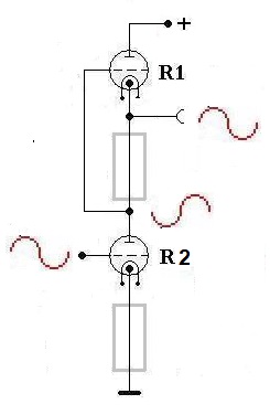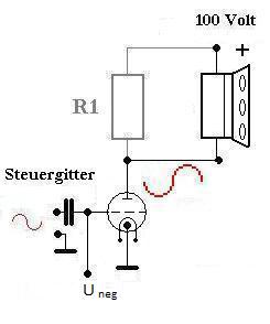 Nochmal zurück zum Spannungsteiler: Ändert die Röhre ihren Inneren Widerstand entsprechend der Steuergitter Vorgabe, wird sich, z.B bei der Kathoden-Basis-Schaltung (Röhre im unteren Teil des Spannungsteiler), am Mittelabgriff, dem Anodenanschluß die Spannung bekannterweise mit verändern. Damit ändert sich für Röhre selbst, der Spannungs-Messwert zwischen der Anode und Kathode,