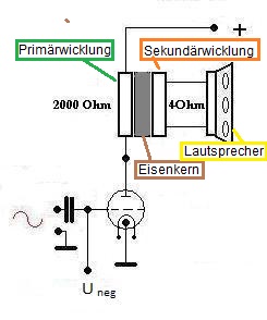 Die Spannungsteiler-Spannungsschwankungen am Anodenwiderstand R5, also die verstärkte "NF" ist mittels C2 gleichspannungsfrei weitergeleitet und als Gitterwechselspannung an die 2. Röhre gelegt. Die Gitterwechsel-(Signal)spannung wird sich hier um den wiederum per Kathodenwiderstand festgelegten Arbeitspunkt bewegen und die Endröhre auslenken. Eine Vorverstärkung der Signalspannung mittels Rö1 ist erforderlich um das weniger empfindliche Steuergitter der Endröhre ausreichend aussteuern zu können. Der Anodenwiderstand für die Endröhre ist der Ausgangsübertrager. Dessen ohmscher, also Gleichstrom-Widerstand ist mit etwa 100 Ohm eher gering. Für die verstärkte Wechsel-Signalspannung stellt diese Übertrager-Spule jedoch einen deutlichen Widerstand, von mehreren 1.000 Ohm dar. Die an diesem Wechselstrom-Widerstand abgegebene Leistung wird als entsprechende Magnetfeld-Änderung über den Eisenblechkern an die, ansonsten unabhänige niederohmige-sekundär Spule übertragen. In dieser Sekundärwicklung wird durch das Wechsel-Magnetfeld eine (in diesem Fall) herabgesetzte Wechsel-Spannung bei jedoch stärkerem möglichen Strom erzeugt, genauer gesagt: induziert. Diese Spannung versorgt den angeschlossenen Lautsprecher.
