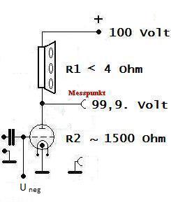 Bei direktem Anschluß normaler Lautsprecher wäre der Spannungsteiler aus R1 und R2 wirkungslos. Aufgrund des niederohmigen Lautsprecher als (R1) und der hochohmigen Röhre (R2) würde sich am Messpunkt die Spannung von der Betriebsspannung 100 Volt kaum unterscheiden können. Die wirksame Wechsel- Spannung am Lautsprecher ist damit sehr gering. Um den Spannungsteiler voll auszunutzen, müßte die Röhre ähnlichen Widerstand wie der Lautsprecher aufweisen. Solch niederohmige Röhren gibt's nicht. Auch wäre die Spule des Lautsprecher (R1) durch den Ruhestrom über die Röhre (R2) gefährlich vorbelastet. Gleichströme durch Lautsprecher (und Kopfhörer) sind idR. nicht zulässig.