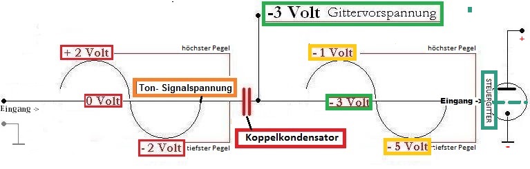 Um die gewählte Vorspannung am Röhrengitter (sowie auch die Betriebs-Gleichspannung innerhalb der Verstärkerstufe) -zu halten und nicht auf angrenzende Stufen abfließen zu lassen, benötigt man Koppelkondensatoren.