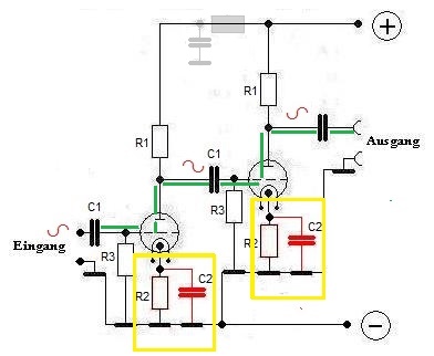 Um ungewollte Wechselspannungsanteile an den Kathoden-Anschlüssen (für eine stabile GitterVorspannung) nivellieren zu können, ist parallel zum Kathodenwiderstand (R2) nun ein Kondensator (C2) wirksam, welcher groß genug ist um für die dortigen Spannungswechsel genügend niederohmig zu sein. Die Wechsel-Signalspannung kann so gegen Minus abgeleitet werden, ist hier also kurz geschlossen. Übrig bleibt, an diesem Punkt des Spannungsteiler, letztlich nur eine feste Gleichspannung, frei von Signalspannung für eine stabile Gittervorspannung.