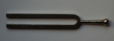 Die angestoßene Stimmgabel schwingt hier im "berühmten Kammerton-A", also mit 440 Hertz, also 440 mal je Sekunde, und zufällig auch - schön sinusförmig.