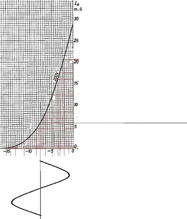 Zu sehen ist hier ein Auszug aus dem Datenblatt zur Röhrentriode ECC82. Es zeigt als Diagramm den Zusammenhang aus: am Steuergitter anliegender negativer Gitterspannung (in V, untere (x) Achse ) und dem dabei nur möglichen Strom durch die Röhre (in mA, rechte (y) Achse) an vier beispielgebend angenommenen Anodenspannungen (Va) 250V, 200V, 170V und 100V.