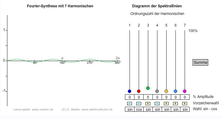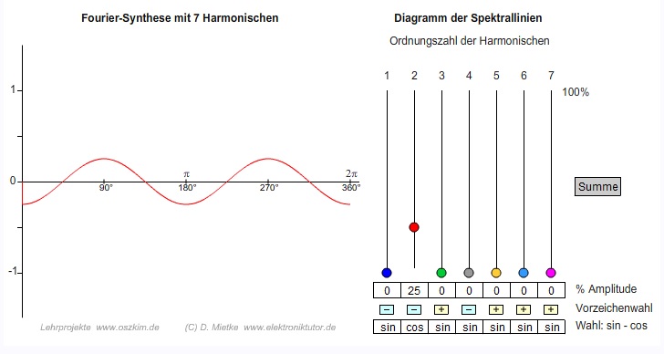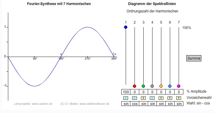 Ausgesprochen hilfreich hierfür war und ist ein interaktives Skript, mit welchem Fourier-Synthesen bis zur 7. Harmonischen, graphisch ausprobiert werden können.