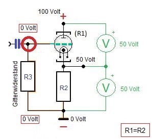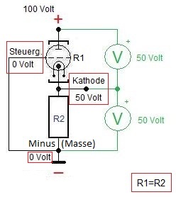 Bei Verwendung einer, im Widerstandswert gleichen Röhre statt R1 wären nun an deren Kathode diese 50 Volt messbar.