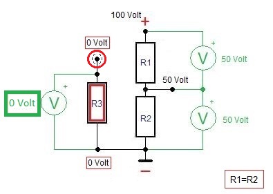 Zeigt das ein Spannungsteiler aus gleich großen Widerständen an hier 100 Volt, mit den zugehörigen Messwerten. Am Mittelabgriff stehen dabei 50 Volt.