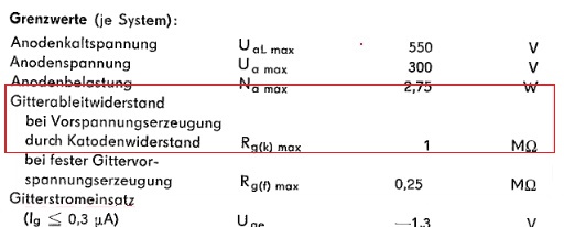 Letztlich bestimmt dann doch der (wenn auch sehr geringe) Steuergitterstrom einen Höchstwert für den Gitter-Ableitwiderstand. Zieht das Gitter mehr Strom als der Ableitlwiderstand ausgleichen kann, verschiebt sich die Gitterspannung und damit der vorgesehene Arbeitspunkt. Die Röhre driftet. Daher ist im Datenblatt zur Röhre der zulässige Höchstwert des Gitter-Ableitwiderstand (RG1) stets angegeben:
