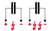 sind die beiden wesentlichen Eigenschaften jedes Kondensator. Diese Eigenschaften sind, (bisweilen verwirrend) im Klartext auf das Bauteil: Kondensator gedruckt. Der gezeigte Elektrolytkondensator speichert Ladung mit einer Kapazität von 2200µF (MikroFarad), und er kann 16V (Volt) Gleichspannung aushalten. Wäre diese Spannung überschritten, sinkt die Lebensdauer durch Leckströme und einhergehender schädlicher Erwärmung. Deutliche Überspannung führt dagegen zum schnellen Abgang; meist mit Knall und Gestank. Alle Elektrolytkondensatoren besitzen bauartbedingt die Besonderheit einer festgelegten Polarität. Daher ist ein Kontakt gekennzeichnet. Zb. mit "+++" oder, wie oben mit "- - - -". für Minus. Eine Verpolung wirkt wie Überspannung. |