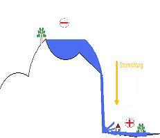 So ist vorweg genommen, daß die freigesetzte Leistung in Form von "Spritzwasser" beim Aufplatschen im Tal, neben der Menge an Wasser gleichsam auch durch dessen Fallhöhe bestimmt wird.
