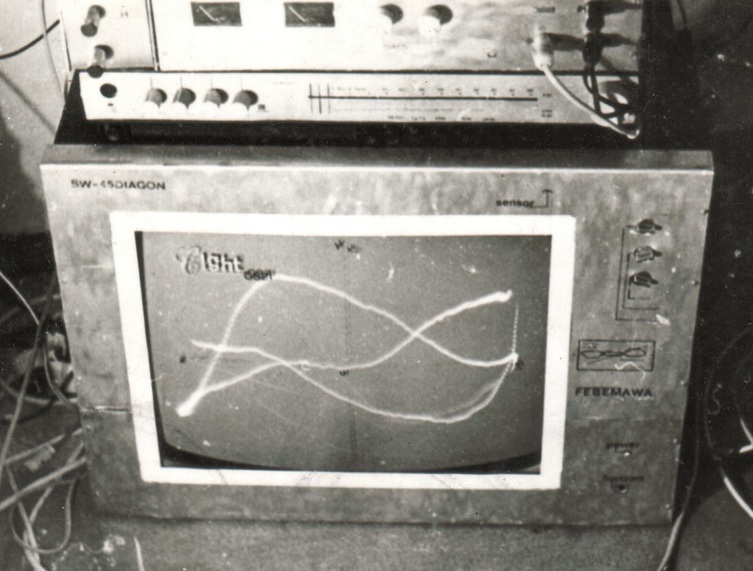 "Disse-Oszi" Fernsehgerät als Oszillograph, Umbau von 1982. Ein angeschlossenes Musiksignal wird auf der Fernseh-Röhre als oszillographische Kurve angezeigt. Der Umbau passt in fünf Sätze: Die beiden Ablenkspulen zur Bildröhre sind von der restlichen Schaltung abgetrennt und die dort fehlenden Induktivitäten durch Dummy's ersetzt. Die jetzt freien Anschlüsse zur Ablenkspule der Bildröhre sind horizontal mit Netzfrequenz aus einen 6 Volt~ Klingeltrafo gespeist. Das genügt um den Strahl bildbreit abzulenken. Die zweite, vertikale Ablenkspule ist statt des Lautsprecher am Ausgang des Tonverstärker angeklemmt. Eingang zu diesem "neuen" Y-Verstärker ist der Fernseh- Lautstärkeregler. Röhren-Fernseher sind leider untrennbar mit Stromschlag-Gefahr unter Hochspannung verbunden. Im Umbau-Beispiel: "FSG-Stassfurt" ist darauf weiter eingegangen: