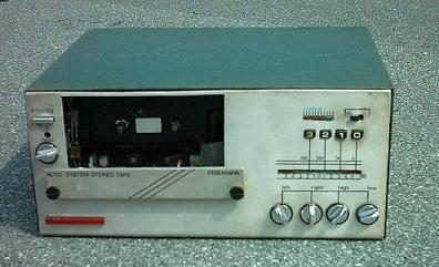Stereo- Tapedeck 1988 Der Kassettenspieler sollte möglichst klein werden (28 x 23 x 12 cm) und mit einer halbwegs partytauglichen Endstufe ( 2x IC A2030 ) ausgestattet sein. 110V Elektromagnete (andere hatte ich nicht zur Verfügung) greifen auf das ursprünglich "handmechanische" Kassetten-Laufwerk (Geracord) zu. So gibt es nur vier kleine Taster (zurück/vor/play/stop) Den Antriebsmotor habe ich zugunsten der Gesamthöhe oben am Laufwerk abgesägt und nach rechts umverlegt. Die Kassette wurde horizontal über zwei Teleskopelemente (aus Stabantennen) mit einem eingelöteten Spindelantrieb motorisch eingezogen oder ausgefahren. Mit dem "Kick-Regler" läst sich die Wiedergabe etwas beschleunigen. Eine Band-Endabschaltung, getrennte Höhen/Bass Regler, LED-Pegelanzeigen sind auch vorhanden. Neben dem Netzanschluß und Lautsprecherbuchsen gibt es auf der Rückseite eine 5pol DIN Buchse zur Signal-Ausgabe oder um die eingebaute Endstufe fremd nutzen zu können. Aufnehmen kann das Teil jedoch nicht.