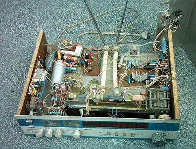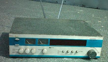 Stereo Radioempfänger 1985 Das UKW-Empfangsteil stammt von einem typischen Plast, Mono-Küchenradio aus den siebzigern. Es wurde mit Dekoder, H/T Klangreglung, Vorstufen und A210K (DDR) Verstärker-IC's ausgestattet, und so zum Stereoradio umgebastelt. Hinter der dunkelroten Plexiglas-Blende befinden sich LED's zur Skalen- und Feldstärkeanzeige. Weiter sind 2 Zeiger-Instumente für L/R-Aussteuerung, Stereo-LED, Mono-Schalter und Netztaster eingebaut, DIN-5 Buchse hinten für Aufnahme/TA-Wiedergabe. Tastenfeld (M/K/U/TA) und Drehkondensator waren vom alten Radiochassis vorgegeben. Die Teleskopantennen für "freien Empfang" im Raum Berlin können bei fester Antenne hinten, waagerecht gekippt und eingeschoben werden. Das Gehäuse aus Aluminium ist drahtgebürstet und mit blauem Glühlampentauchlack/Klarlack geAirbrusht, -na damals hieß sowas noch "Mundspritze".