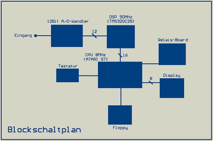Ein angeschlossenes Audiosignal wird durch Fouriertransformation ausgewertet, um das Frequenzspektrum darzustellen zu können. Es wurden 12 Frequenzbänder ausgewählt die das Audiospektrum weitgehend abdecken.